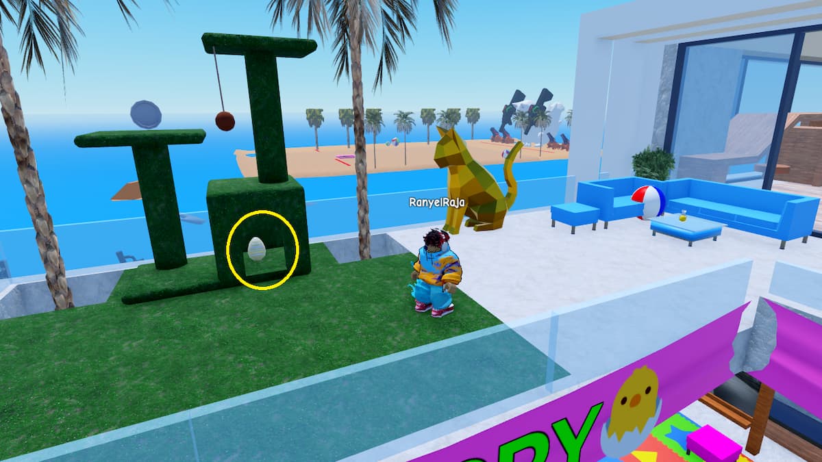 • In the same easter bunny mansion, go to the first floor and reach the balcony area. Here, you will find a large golden cat statue and a cat house play area. Look into the bottom of this play area to find a white egg.