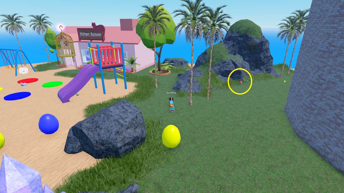 • Egg Number 4 is on the other side of the island in Kitten School. Cross the water area using your dolphin ride and reach the Kitten School. Here, look behind the large rock terrain to find a red-colored egg.