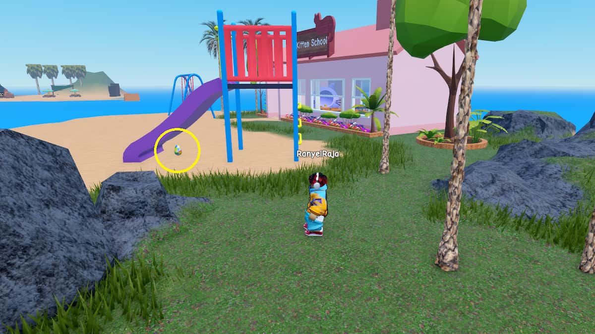 • This egg is also very near to the previous one. Just opposite the Kitten School, you will locate a purple slide. Look at the bottom of the slide to see a multi-colored egg.
