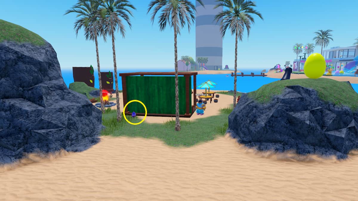 • The final and seventh egg is on the Food Island north of the Kitten School. You can use the cannon on Mansion Island or travel using your dolphin to reach this location. Here, you will find a green egg behind the stall.