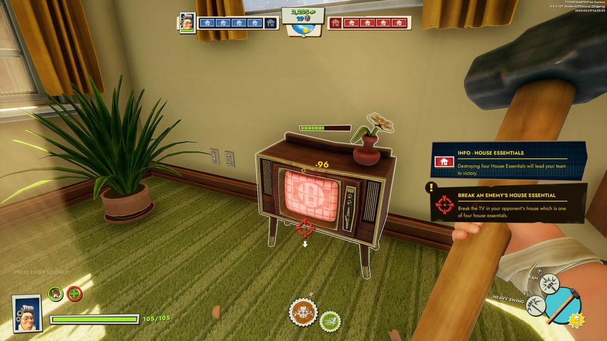 Whichever team manages to destroy the enemy's all four equipment first come out victorious. To do so, you'll have to pass through enemy defenses, destroy the entrances (door or window) first, and then knock up the furniture. However, this isn't that easy as the enemy will be doing the same and you must defend your belongings as well. Furthermore, stay prepared for a melee battle with the opponents.
