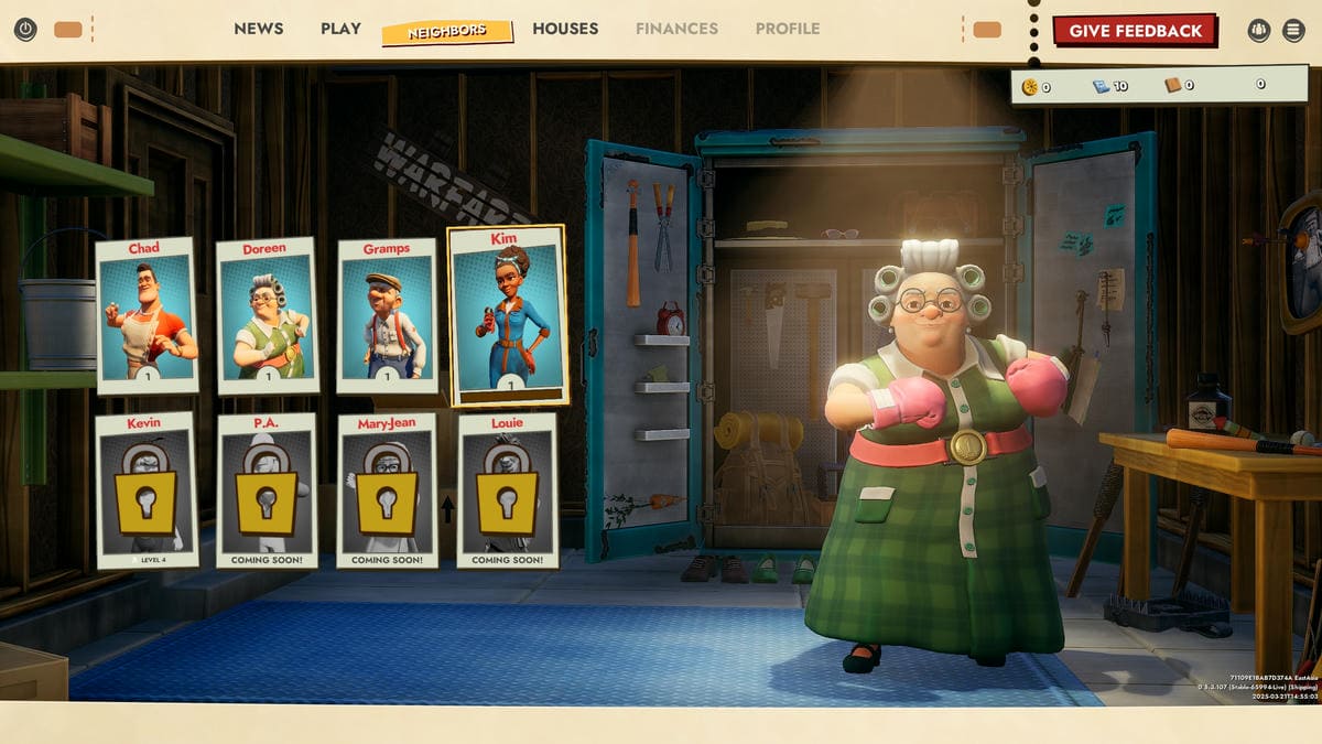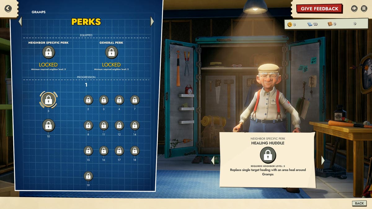 The game doesn't have a skill tree but a selection of Perks that are automatically unlocked as you level up your hero. Each character can be equipped with one Neighbor Specific Perk and a General Perk (two skills in total). As the name implies, the former is unique to the Neighbor while the latter is constant for all. Pick the ones that aid you in your approach to the game, be it offense or defense.